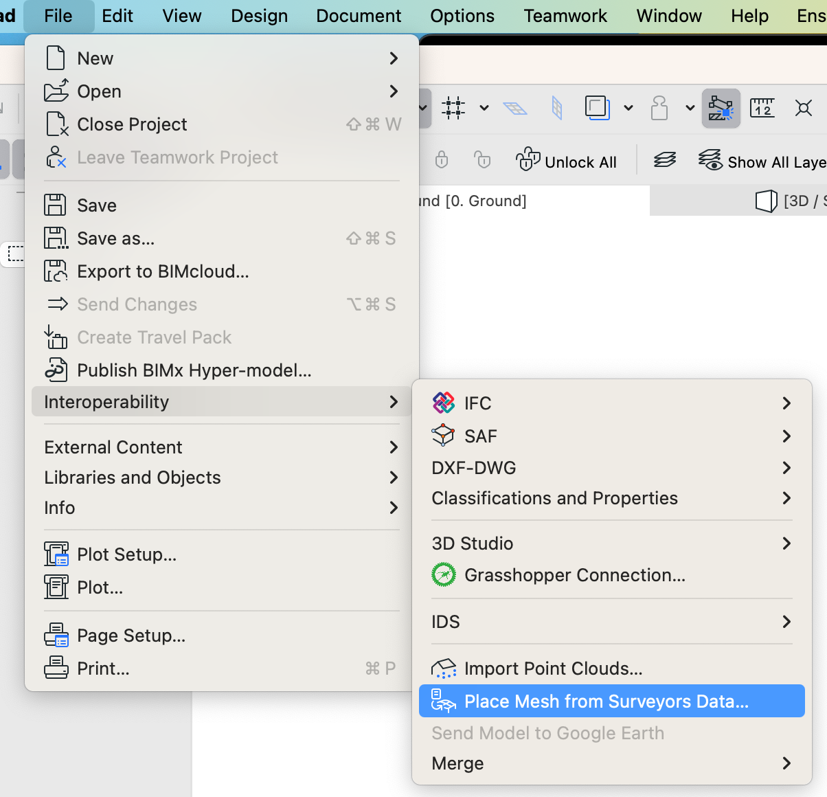 When importing into your ArchiCAD file, there are two main options: import as a pointcloud reference object OR import as a mesh from the points. Only .XYZ / .TXT files will be available to be imported as a mesh.